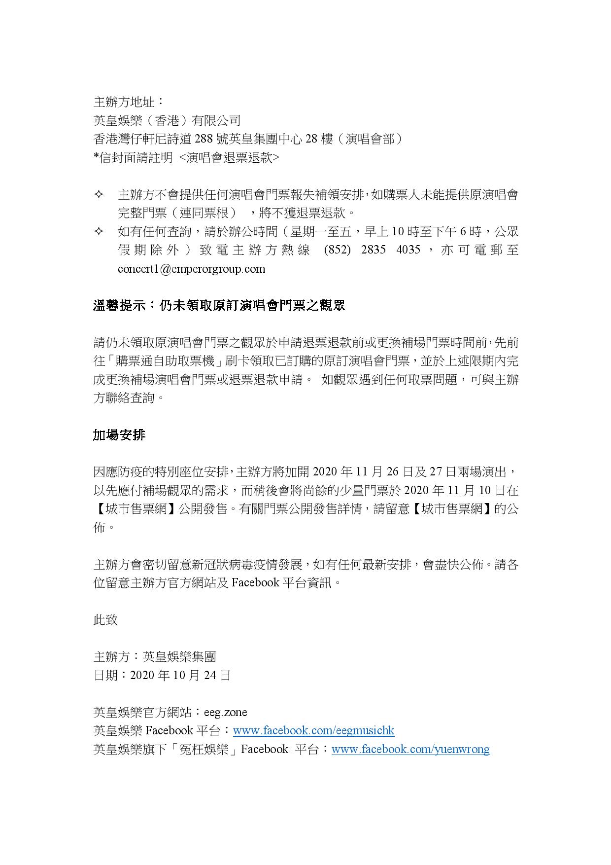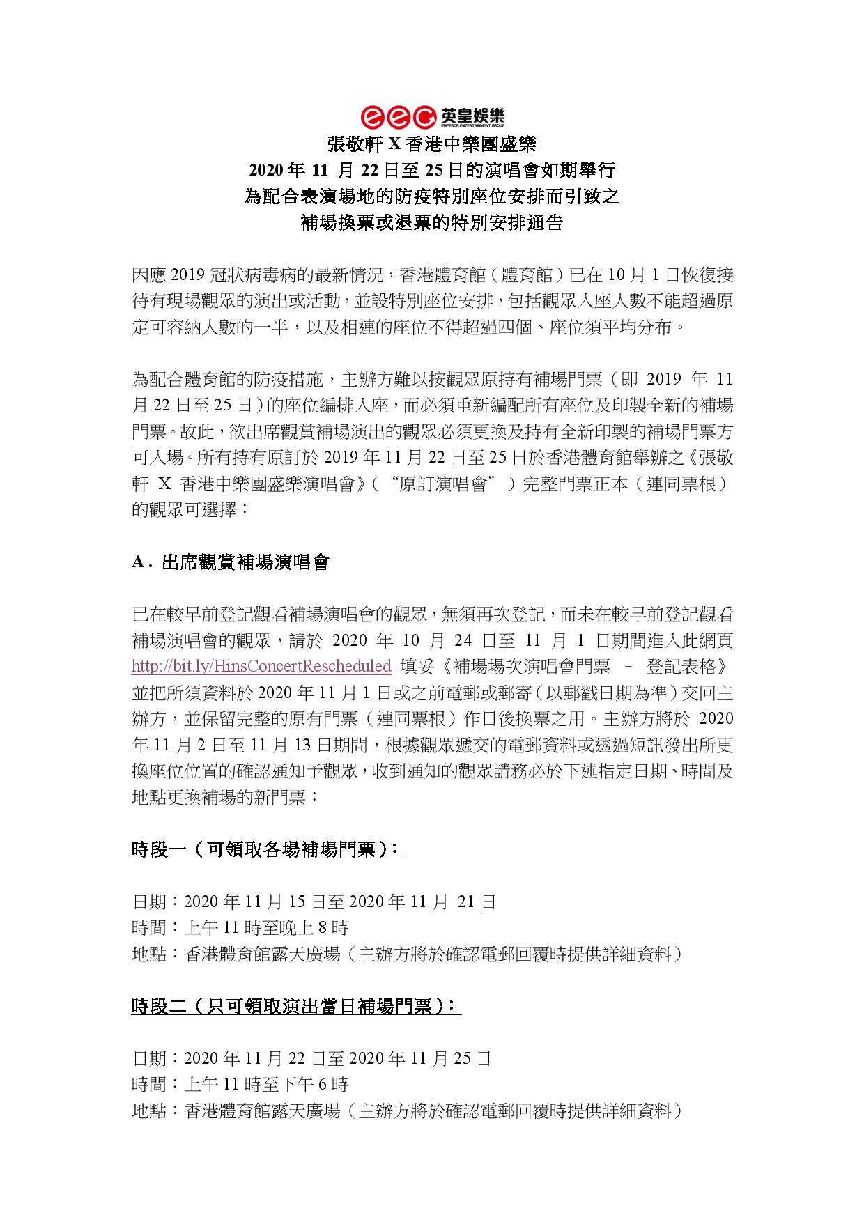 「張敬軒x 香港中樂團盛樂演唱會」補場換票或退票安排